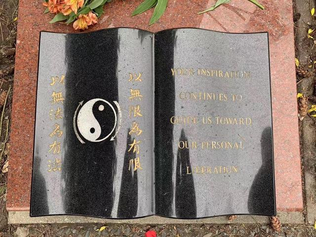 另外,在墓碑前面的坟冢上还镶嵌着一块呈现翻开书籍形状的石刻,其中左侧页面中间雕刻着阴阳鱼,两侧则刻着12个字:以无法为有法,以无限为有限。右侧页面则是12个字的英文翻译:Your inspiration continues to guide us toward our personal liberation。